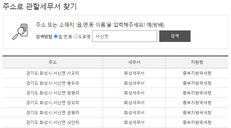 사이트에 접속하면 위 사진처럼 '주소로 관할세무서 찾기'라는 메뉴가 있습니다. 여기서 거주하시는 지역의 읍/면/동 명칭을 적으시고 검색을 누르시면 됩니다.