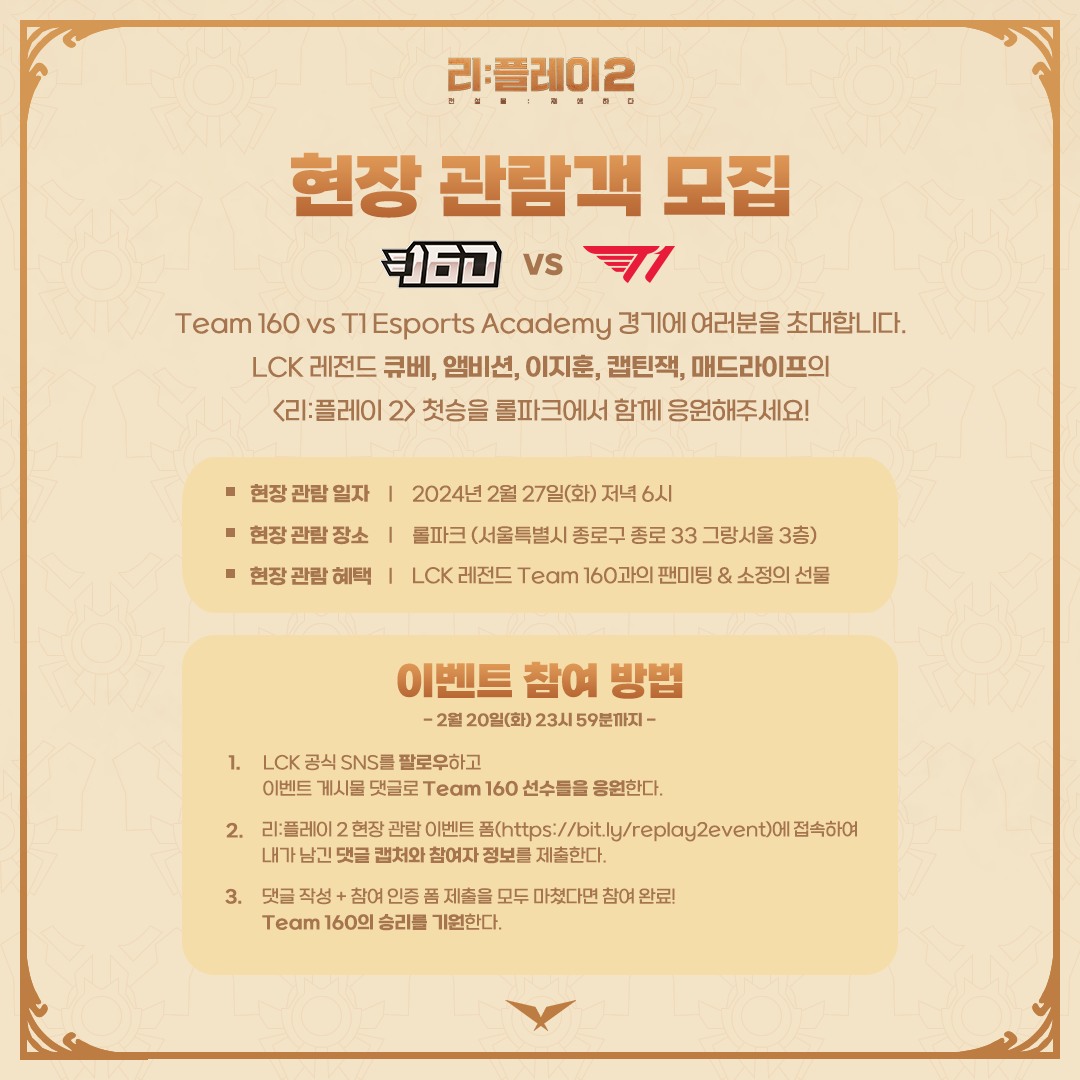 팀160과 T2사이에서 진행되는 유관중 경기인만큼, 관심 있는 분들이라면 꼭 참여하시길 바랍니다. 현장 관람에 당첨되면 팀 160 선수들과 팬미팅도 있다고 합니다.