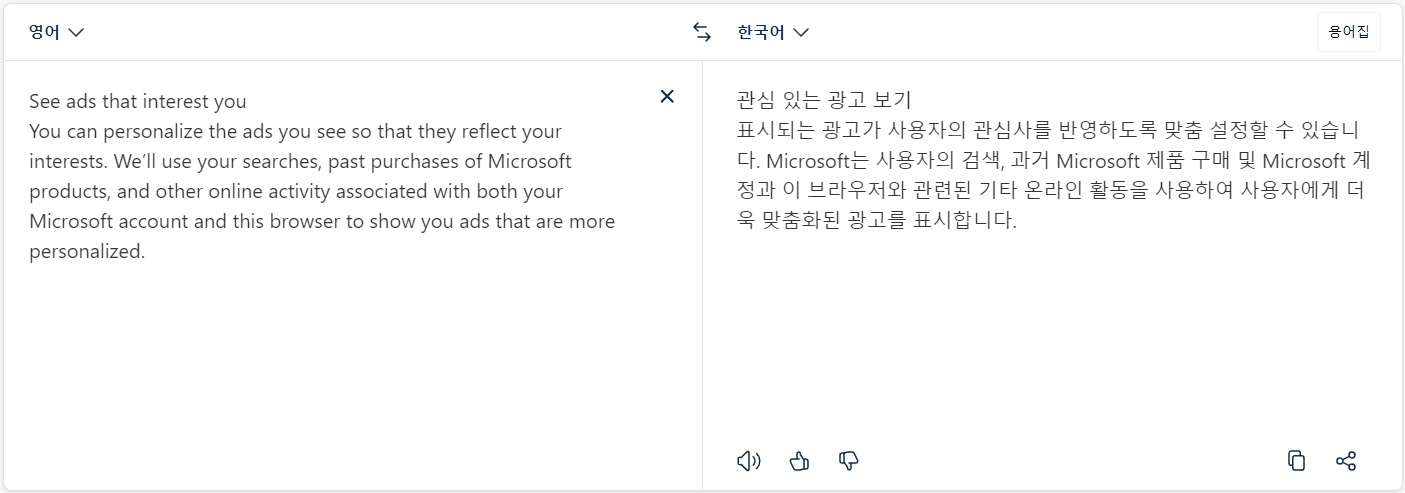 이번에는 마이크로소프트 홈페이지의 광고 설정에 대한 도움말 일부분을 입력해봤습니다. You에 대해서 구글은 '귀하', 파파고는 '당신', 딥엘은 '사용자'로 번역한 것이 눈에 보입니다. 그리고 딥엘만 personalized를 '맞춤화'로 차별되게 번역했습니다.
