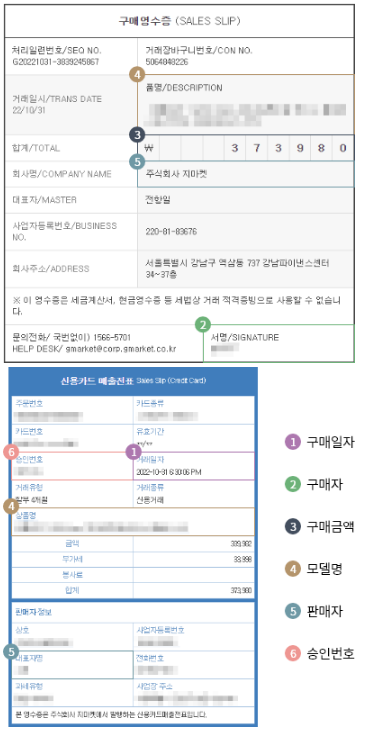 온라인 구매시, 영수증과 카드 매출전표 등을 조합하여 위 정보가 모두 확인될 수 있도록 서류를 갖춰야 합니다.