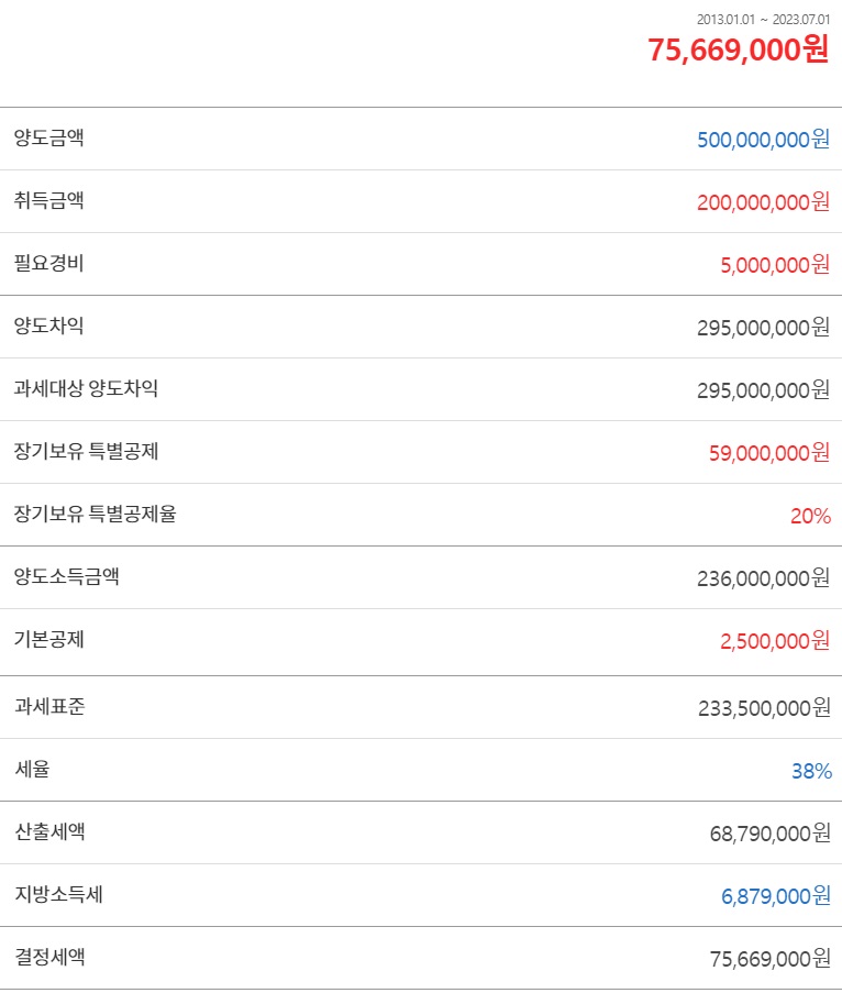 화면이 작아서 글씨가 좀 잘리긴 했지만, 취득가액에 2억, 양도가액에 5억, 필요경비에 500만 원을 입력했습니다. 취득일자는 10년 전이니 2013년 1월, 양도일자는 2023년 7월로 임의 입력했고, 실제 살던 집을 팔았다는 가정하에 거주기간을 10년으로 잡았습니다.