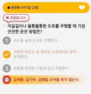 모의고사 풀기를 시작하면 위 사진처럼 객관식 시험문제가 나타납니다. 운전면허 관련해서 지식이 없다면, 시험문제를 반복적으로 풀면서 천천히 지식을 쌓으시면 됩니다.