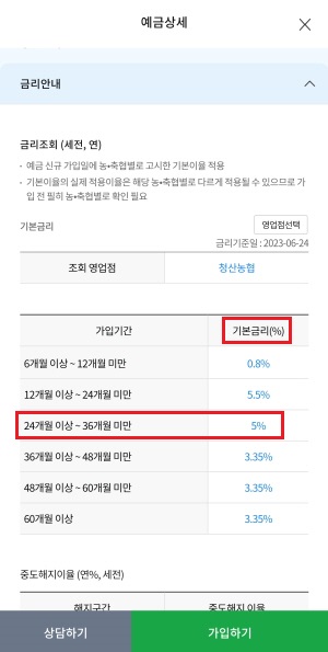 물론 해당 상품의 기본금리가 5% 이상일 가능성은 거의 없으니, 직접 접속해서 우대금리 조건을 확인해 봐야겠다고 생각했습니다. 그런데 위 사진을 보시면 아시겠지만, 농축협의 상품은 우대금리 조건 없이 그냥 기본금리입니다. 이런 상품은 가입하고 유지만 한다면, 제가 예시로 들었던 2년 500만원이 가능하다는 의미입니다.