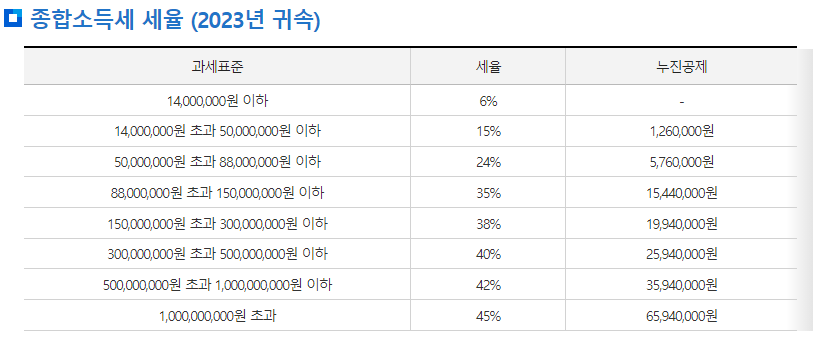 우리나라는 누진세가 적용되어 소득의 크기에 따라 세율이 변경되는데, 2023년 귀속 세율은 기준은 아래와 같습니다.