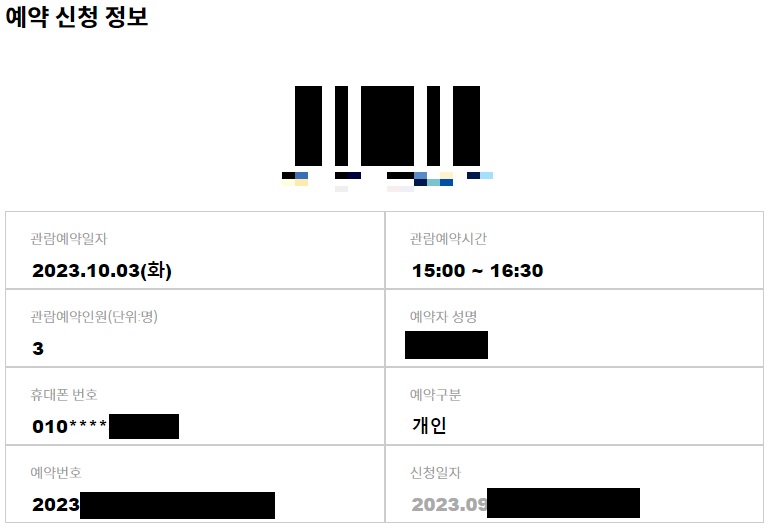 한번 예약신청을 하면, 관람예약일자, 관람예약 시간, 예약인원은 수정이 불가능합니다. 무조건 예약 취소 후 다시 예약신청을 해야 하는 부분 참고 바랍니다.