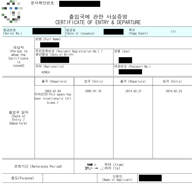 만약 여기서 맨 마지막 입국인 '2014.02.24'가 안적혀있다면, 저는 '2014.02.21'에 출국해서 우리나라로 입국한 적이 없다는 의미입니다.