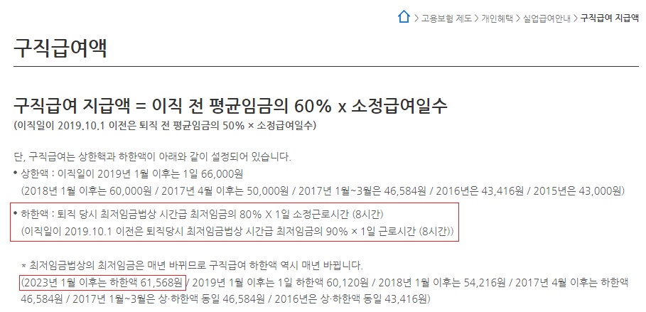 공지사항 등에서 별다른 내용을 확인할 수 없어 바로 '구직급여액' 설명란을 확인했습니다. 얼마 전에 제가 확인했을 때와 변경점은 없었고, 여전히 최저임금의 80%와 하한액 61,568원을 명시하고 있습니다. 기타 Q&A에서도 실업급여 제도가 변경된다는 내용은 확인할 수 없었습니다.