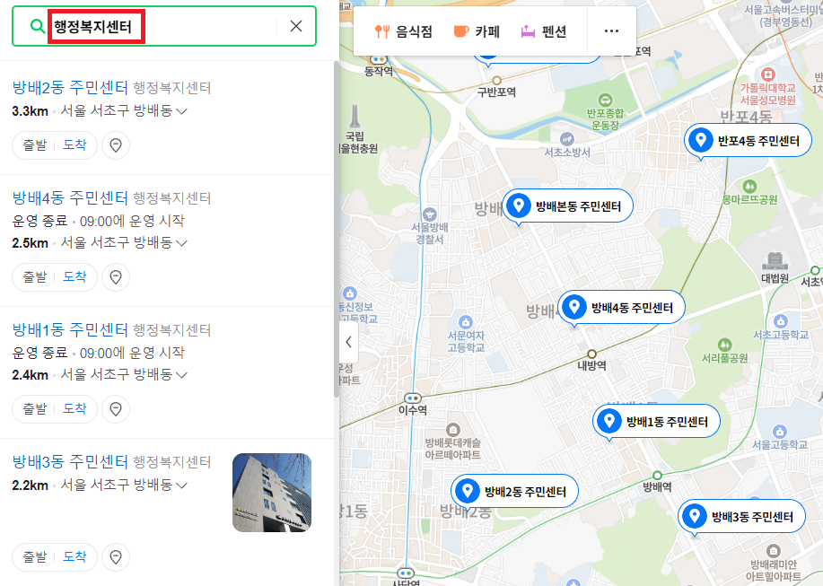 행정복지센터는 '네이버 지도' 등 지도에서 검색하시면 쉽게 위치를 찾으실 수 있습니다. 아래 사진은 네이버 지도에서 '행정복지센터'라고 검색한 결과입니다.