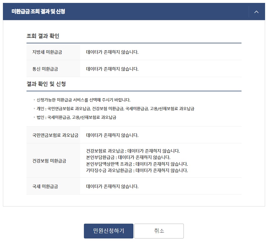 개인으로서 조회할수있는 모든 항목에 체크하고 조회를 했지만, 아쉽게도 제게는 국세 지방세 미환급금이 전혀 없었습니다. '조회 결과 확인' 칸에서 환급금이 있으면 별도의 환급 신청 사이트를 방문하여 환급을 신청하셔야 하고, 국세나 건강보험 등 '결과 확인 및 신청' 칸에서 환급금이 있으셨다면 정부24 조회 화면 아래의 '민원 신청하기' 버튼을 누르셔서 환급을 신청하시면 됩니다.
