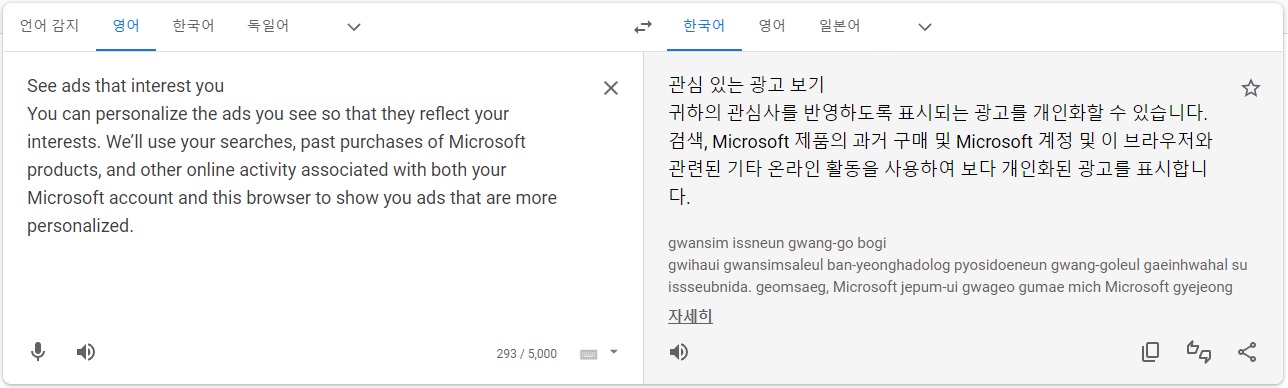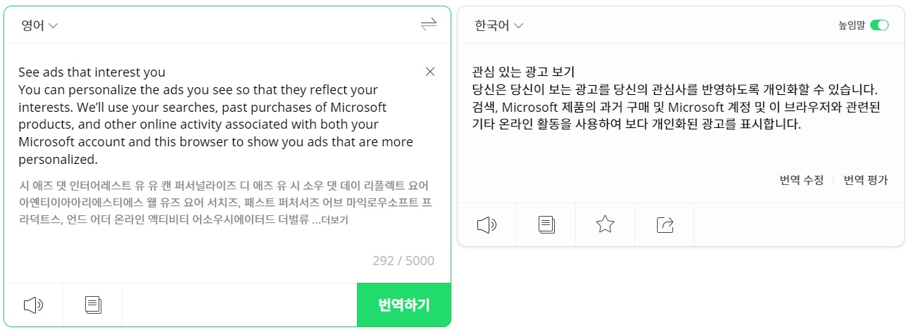 이번에는 마이크로소프트 홈페이지의 광고 설정에 대한 도움말 일부분을 입력해봤습니다. You에 대해서 구글은 '귀하', 파파고는 '당신', 딥엘은 '사용자'로 번역한 것이 눈에 보입니다. 그리고 딥엘만 personalized를 '맞춤화'로 차별되게 번역했습니다.